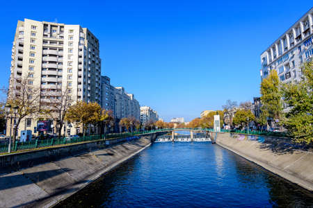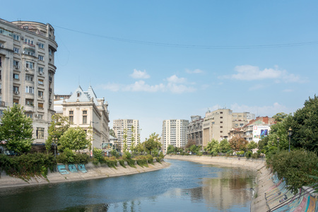 Dambovita river in downtown Bucharest; residential and office buildings on its shoreline, Romania