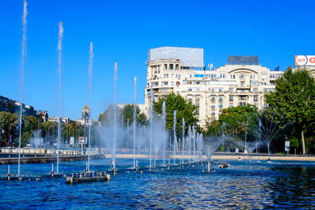 BUCHAREST, ROMANIA - AUGUST 17, 2021: Fountain at Unirii Square at the center of city of Bucharest, Romania