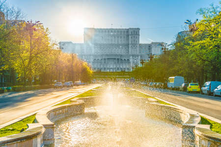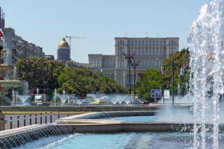 BUCHAREST, ROMANIA - MAY 28, 2016: Union Square Fountain And House Of The People Or Parliament Palace (Casa Poporului) View From Union Boulevard (Bulevardul Unirii) In Downtown Bucharest.