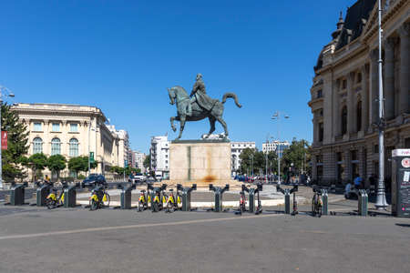 BUCHAREST, ROMANIA - AUGUST 17, 2021: Equestrian Statue of Carol I in front of University Library in city of Bucharest, Romania