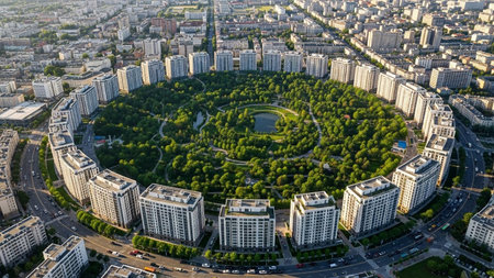 Aerial drone view over Bucharest downtown cityscape with Cismigiu Gardens. Capital of Romania.