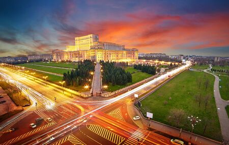 Bucharest, Romania - September 2, 2021: The Palace of Parliament building in Bucharest at sunset.