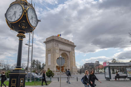 Moody view of national romanian triumphal arc in bucharest,people and traffic transportation