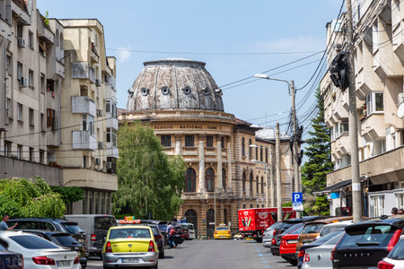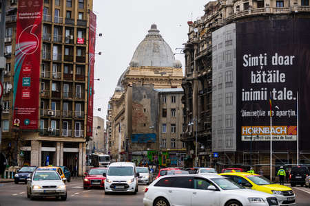 Busy traffic in downtown Bucharest around Central University Library housed in Carol I University Foundation building