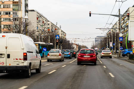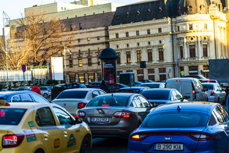 Car traffic at rush hour in downtown area of the city. Car pollution, traffic jam in the morning and evening in the capital city of Bucharest, Romania, 2021