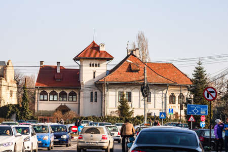 Cars in traffic car traffic at rush hour in downtown area of Targoviste, Romania, 2020