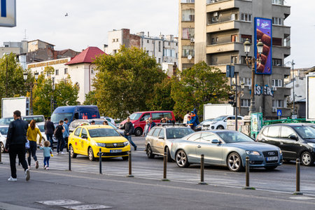 Streetlife with taxi in Bucharest, Romania. I have taken this photo in April 2018 during my visit of Romania