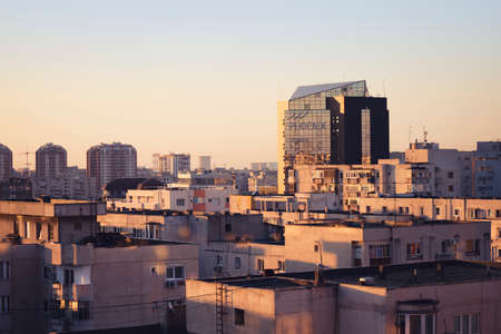 Bucharest, Romania - August 13, 2021: Overview of the old part of Bucharest during a summer sunset. New and old buildings together.