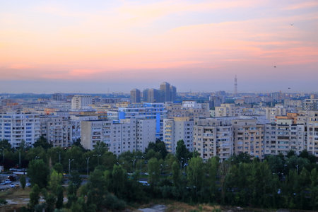 Bucharest, Romania - August 13, 2021: Overview of the old part of Bucharest during a summer sunset. New and old buildings together.