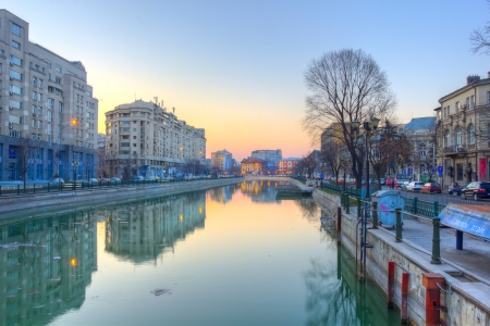 Dambovita river in Bucharest downtown at dusk - HDR