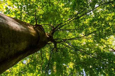 A striking perspective of a large tree captured from its base, showcasing the extensive network of branches and vibrant green leaves. The upward view reveals the tree's height against the sky, illuminated by sunlight. This image is suitable for various commercial uses, including environmental themes and nature-related content.