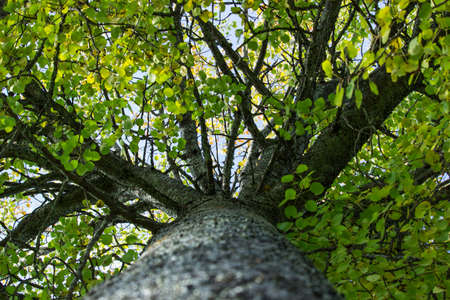 Tree with green and yellow leaves looking up through canopy, vertical aspect