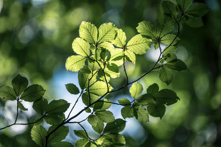 Beech twig with illuminated leaves by sunlight in the forest during sunny day. Backlit greenery in nature.