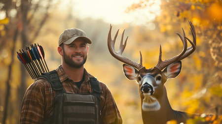 Big game hunter checks out the deer he shot, looking at the antlers. Concept for deer hunting, deer tag, poaching.