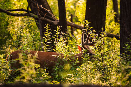 Whitetail buck deer (Odocoileus virginianus) with velvet antlers standing in the forest during late summer.