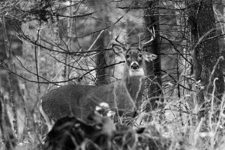 Black and white portrait of a White-tailed Buck (Odocoileus virginianus) with velvet antlers in the forest during late summer. Selective focus, background and foreground blur