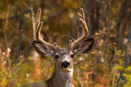 Beautiful portrait of Mule deer with big antlers or horns in the autumn colored forest.