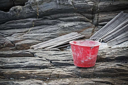 A sea bucket being filled with water from a small waterfall near a rocky coastline.