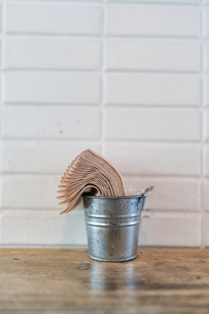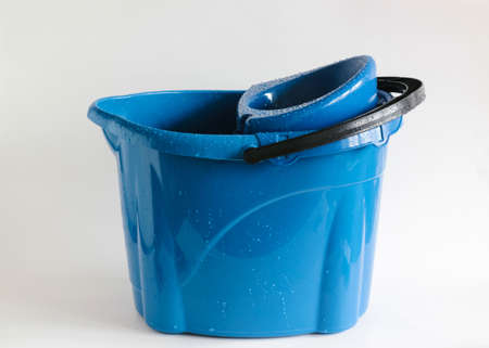 Iron yellow bucket with red wooden figures on a blue background, empty space on the right