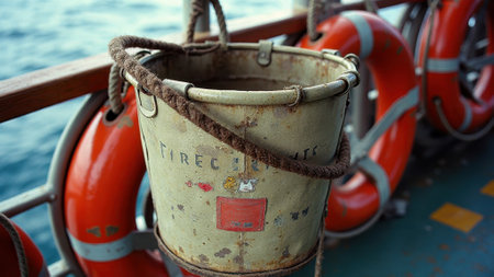 Vintage fire bucket hanging on ship with lifebuoys in background.