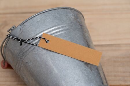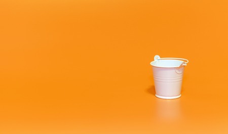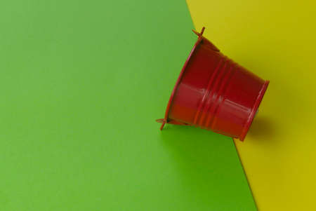 Minimalist composition with a childs toy bucket on a gray-pink background. Metal empty bucket on two-color surface. Top view.