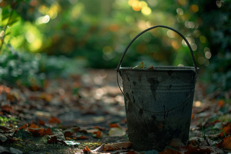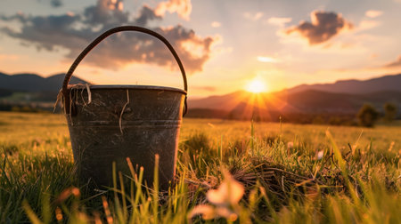 Rustic bucket sits in vibrant green field, illuminated by warm glow of sunset. sun casts golden hue over landscape, creating serene and peaceful atmosphere