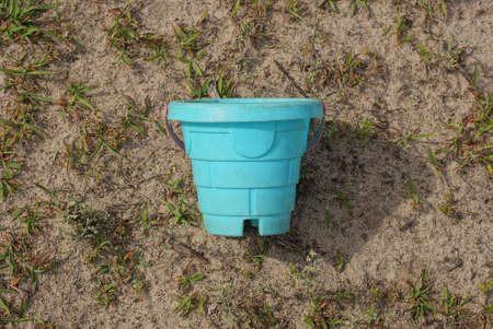 one small blue plastic bucket toy lies on the gray earth and green grass in the street