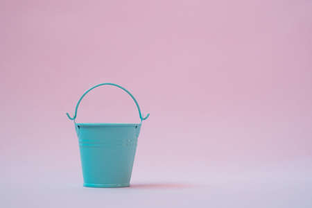 Blue empty mini bucket on pink blue pastel background. Minimalism. Trend color concept. Top view