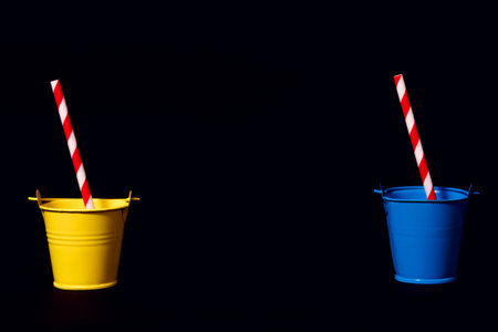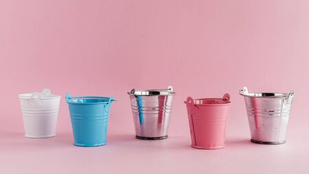 Two empty buckets of purple and red color on a blue background. Business concept. Web banner.