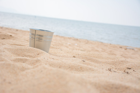 A peaceful beach shot with a single sea bucket left behind, surrounded by soft ripples of sand.