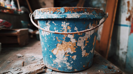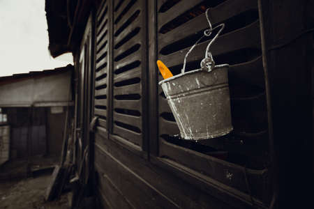 Yellow paintbrush inside the metal bucket hanging on the brown wooden wall. Moody and dark photo of paint equipment in the shed (hovel).