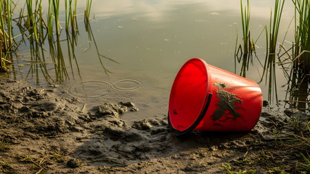 A red plastic bucket lies abandoned on a muddy riverbank near the water's edge. The scene highlights issues of pollution and environmental waste in natural water bodies.