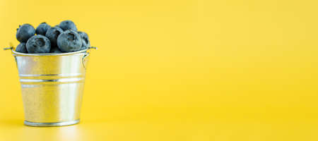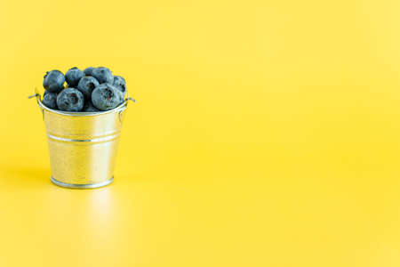 fruits and vegetables, vitamin, healthy food and drink, traditional medicine, gastronomy concept - layout purple blueberry berries in metal bucket with white dot on bright yellow background copy space