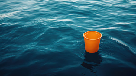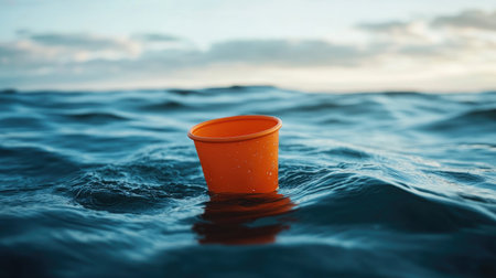 A vibrant orange plastic cup floats serenely on calm ocean waves at dusk, capturing a moment of tranquility in nature's beautiful setting.