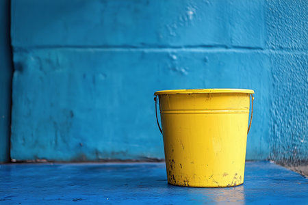 A bright yellow bucket stands alone against a vivid blue wall. The simple yet striking contrast creates an attractive focus in an urban setting, highlighting everyday objects.