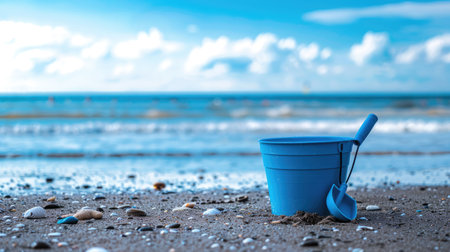 An orange bucket and shovel are resting on the sandy beach, surrounded by azure water and a clear sky in a coastal ecoregion. A perfect spot for leisure and travel in this natural coastal landscape