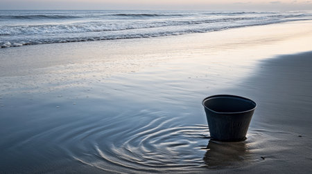 A sea bucket being rinsed by ocean waves, creating a dynamic and playful image.