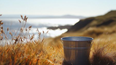 A sea bucket nestled in dune grass, with a panoramic view of the sparkling ocean beyond.