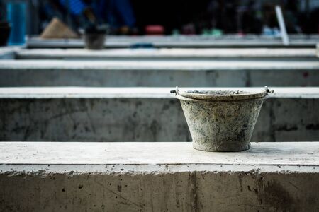 Black plastic bucket filled with cement water stains. Placed on a large concrete beam. On site construction, selective focus.