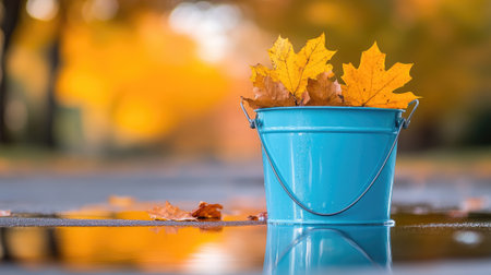 An empty blue bucket sitting on the surface of water with autumn leaves floating in it. The background is blurred to emphasize that scene. --chaos 30 --ar 16:9 --v 6.1 Job ID: b37eb484-049e-499f-a102-e5ac34fe7aab