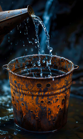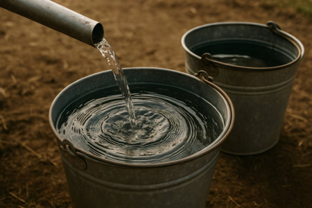 Fresh water flowing into a metal bucket, creating circular ripples on the surface. Another bucket stands in the background