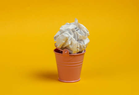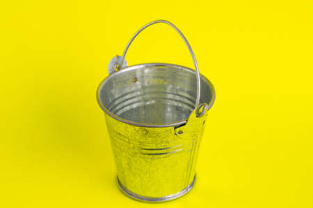 Empty mini pink bucket on a yellow background. Studio shot with shadow
