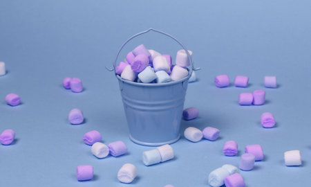 Mini bucket with a lot of marshmallows on blue pastel background. Minimalism. Sweets
