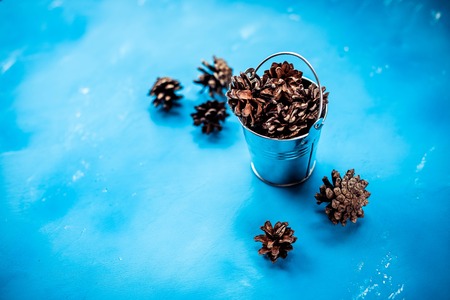 Close-up of many brown color natural dry pine cones isolated on blue background.Copy space. PINE CONES IN A METAL BUCKET.New Years decoration details.