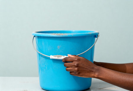 A cleaning lady holds a yellow bucket filled with cleaning supplies while preparing to tackle household tasks in a tidy setting.