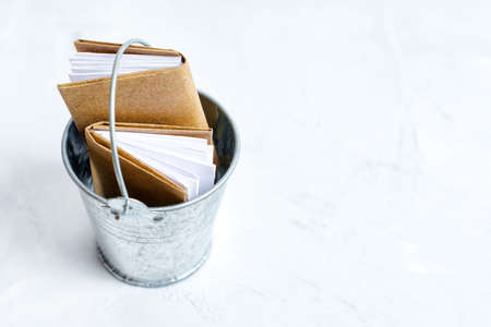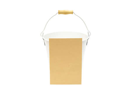 Small white garden bucket with wooden handle and a blank sheet of craft paper isolated on white. Bucket list concept.