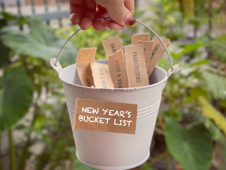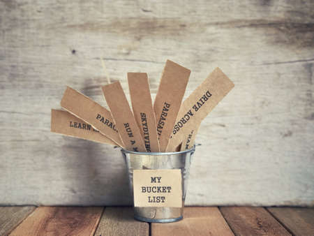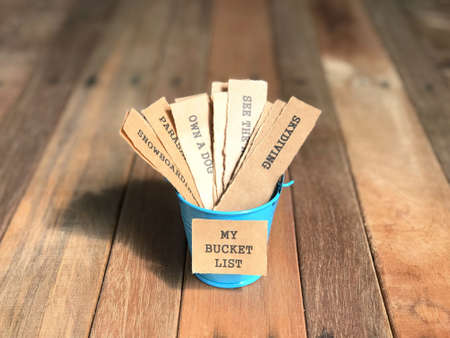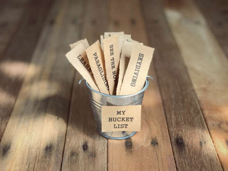Motivational and inspirational wording - My Bucket List written on paper. There are list of wishes written on papers and placed inside the bucket.