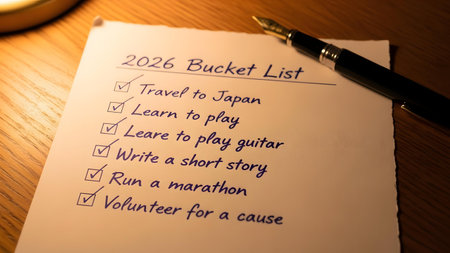 A close-up shot of a handwritten 2026 bucket list on a piece of paper, with several items already checked off, next to a classic fountain pen on a wooden desk.