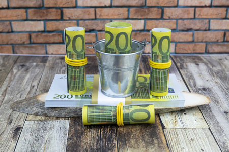 Financial or wealth concept with rolls of 200 Euro money and wads of banknotes arranged in a small metal bucket on sliced wood over marble. High quality photo.