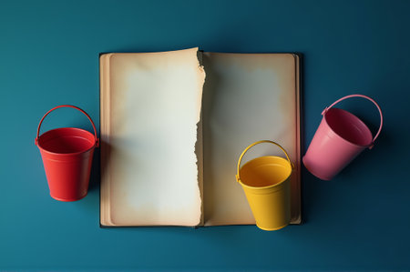 An open book lies on a vibrant blue background, its torn page suggesting untold stories. Nearby, bright red, yellow, and pink buckets evoke a playful, artistic ambiance, sparkling creativity.